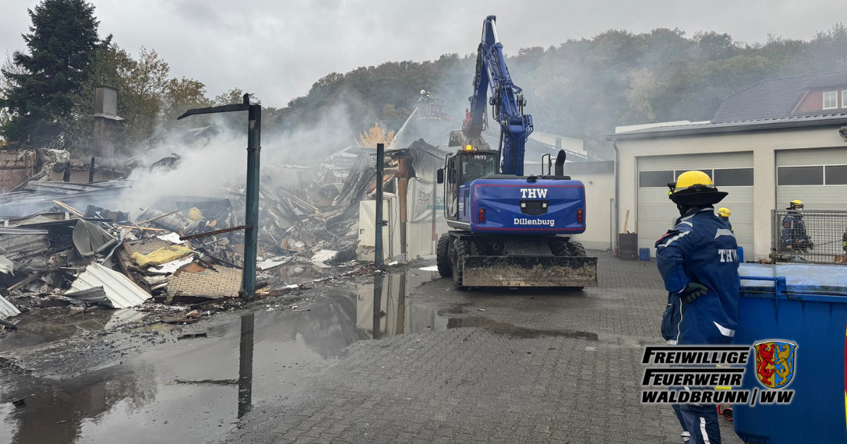 Zur Unterstützung der Löschmaßnahmen wurden Radlader und Bagger des THW eingesetzt, um den Brandschutt auseinander zu ziehen und ab zu tragen.